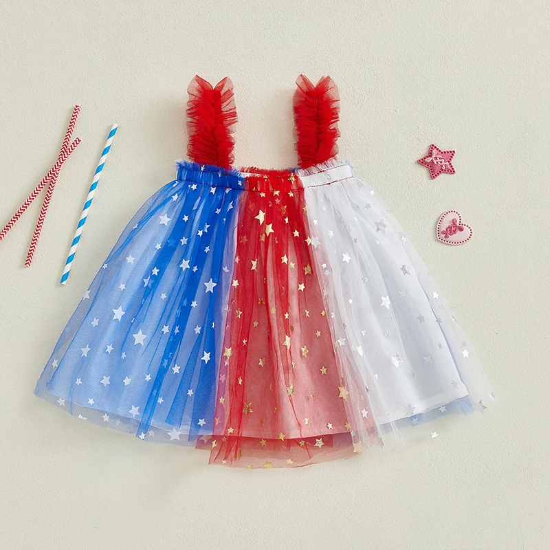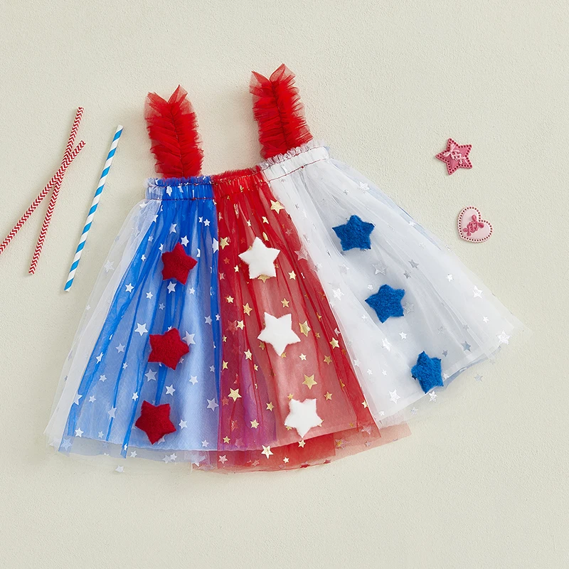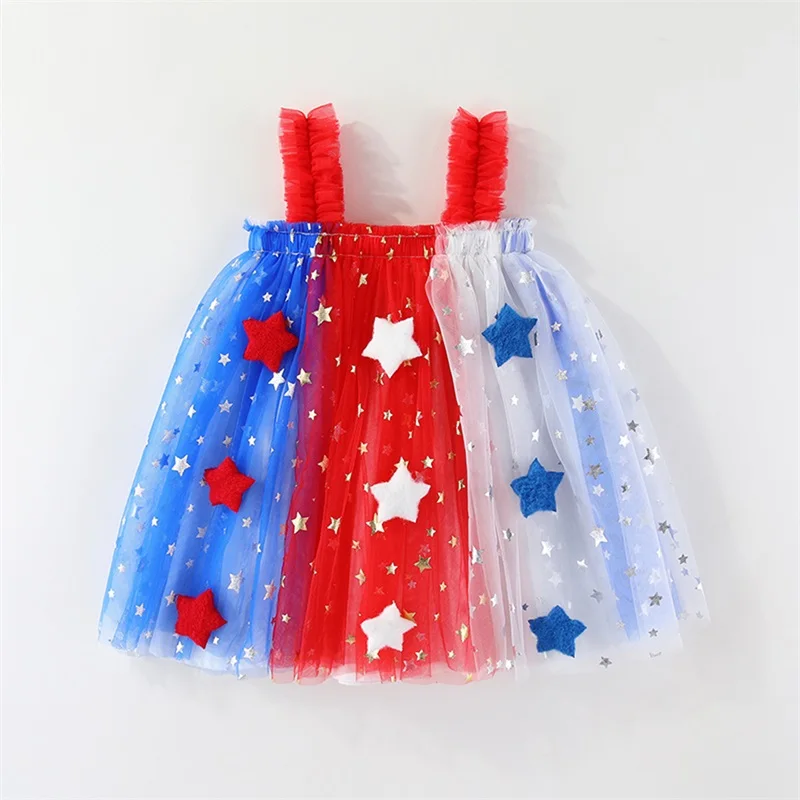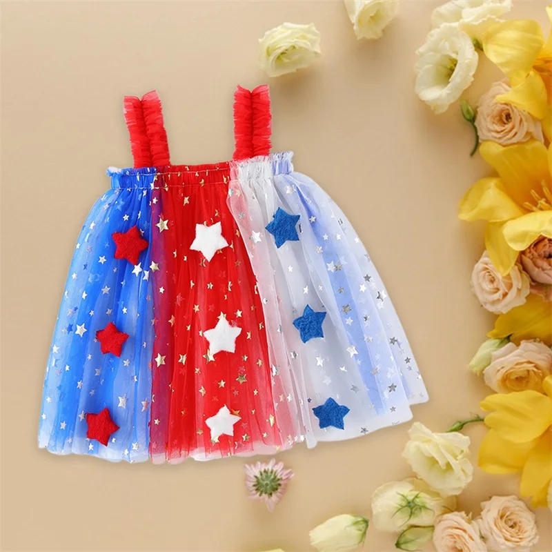 Independence Day Toddler Girl Dress Patriotic American Flag Print Sleeveless Suspender Tulle A Line Dress for Summer Celebration